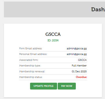 1. Firm Administrator should log into the website by clicking on the green user icon on the right side of the navigation menu. (See image point 2 In individual member above). You will need your membership number, if you have forgotten this, please contact admin@gscca,gg Going forward you should keep this information in a safe place. If you have forgotten your password, you will need to reset it see Help File: https://gscca.gg/help/resetting-your-password/